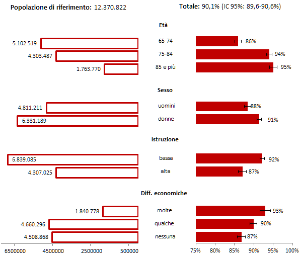 L’uso dei farmaci è più frequente tra gli over 75enni (94% vs 88% nella classe 65-74 anni), varia di poco la percentuale dopo gli 85 anni (95%); tra le donne (91% vs 88% uomini) ed è forte la differenza nel consumo legata all’istruzione (bassa istruzione 92% vs 87% alta ) e alle difficoltà economiche (molte difficoltà 93% vs 90% qualche difficoltà vs 87% nessuna).