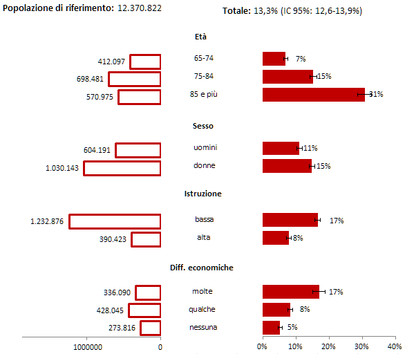 I problemi di vista e masticazione interessano rispettivamente il 13% e il 15% degli anziani. Anche in questo caso sia la difficoltà nel leggere cose da vicino e fare piccoli lavori, sia quelle nel masticare cibi più difficili come carne e mele aumenta con l’avanzare dell’età, tra chi ha un basso livello di istruzione e tra chi ha maggiori difficoltà economiche. A differenza dei problemi di udito si rileva un dato significativamente diverso per genere, fra le donne, il 15% ha problemi di vista (11% fra gli uomini), il 17% di masticazione masticare (13% uomini). Tra gli over 85enni la quota di persone con problemi di vista arriva al 31%, stessa quota (31%) si riscontra per quelli con problemi di masticazione. Tra chi ha molte difficoltà economiche le due problematiche arrivano rispettivamente al 17% e 22%.