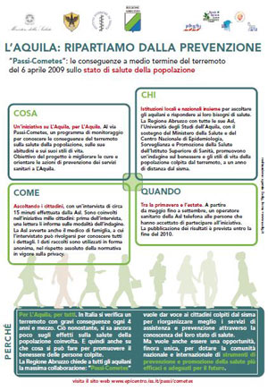 Il fatto che nelle aree colpite dal terremoto fosse attivo il sistema di sorveglianza Passi ha permesso di progettare uno studio – Cometes – per valutare l’impatto del terremoto sulla salute della popolazione colpita destinato a ricavare indicazioni per orientare meglio le politiche e i servizi sanitari e per migliorare le conoscenze su quegli effetti dei disastri naturali che durano nel tempo. Lo studio Cometes, è stato condotto grazie al lavoro della rete di servizi e operatori che conduce il sistema di sorveglianza in Abruzzo e a una partnership istituzionale che lo ha sostenuto dal punto di vista finanziario e scientifico. Leggi il rapporto Istisan 13/2 “Risultati dello studio CoMeTeS (Conseguenze a Medio Termine del Sisma): stato di salute della popolazione dopo il terremoto del 2009 in Abruzzo” (pdf 424 kb), pubblicato a marzo 2013 dall’Istituto superiore di sanità.