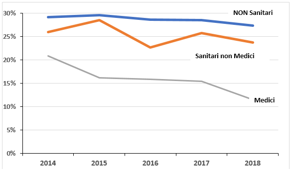Bisogna evidenziare che, in questo studio, gli operatori sanitari non medici sono un gruppo non omogeneo dal punto di vista socio economico, perché include infermieri, operatori socio sanitari e anche i tecnici tra i quali chimici, biologi e fisici. Certamente la quota più importante è quella degli infermieri ed è rilevante che in questo sottogruppo le donne fumano quanto gli uomini.