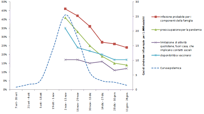 - tra l’11 e il 24 gennaio, meno di un intervistato quattro (24%) ritiene probabile che qualcuno nella propria famiglia possa essere colpito dall’influenza A/H1N1v