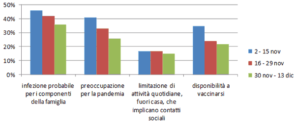 - diminuiscono anche le persone preoccupate per sé e per la propria famiglia a causa della pandemia: dall’inizio di novembre questa quota è scesa dal 41% al 26%