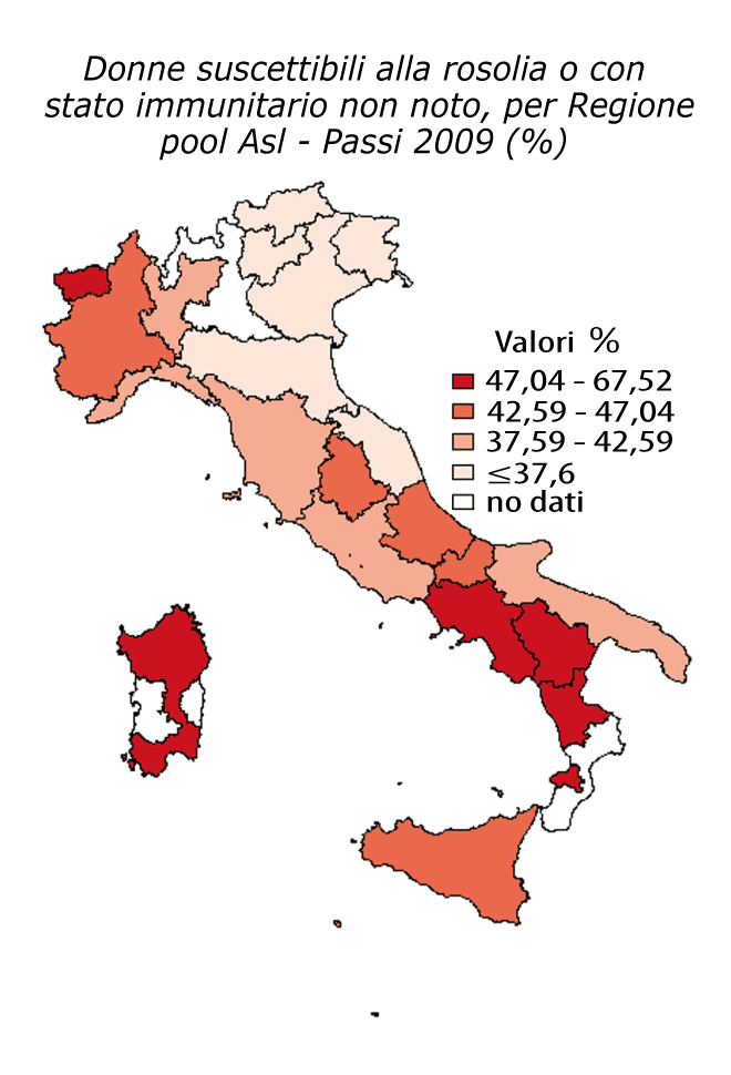 La proporzione di donne in età fertile il cui stato immunitario nei confronti della rosolia è negativo o non noto è variabile nelle diverse Regioni: