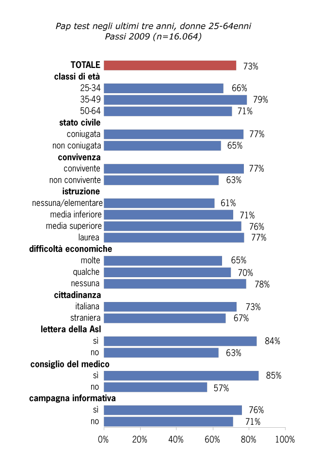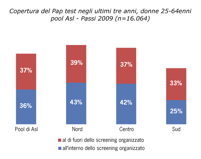 Nel 2009, nelle Asl italiane che hanno partecipato alla rilevazione, circa tre donne 25-64enni su quattro (73%) hanno eseguito un Pap test preventivo nel corso dei tre anni precedenti l’intervista. La copertura complessiva al test di screening raggiunge valori elevati al Nord (82%) e al Centro (79%), mentre è più bassa al Sud (58%).