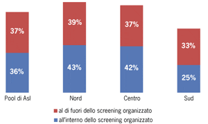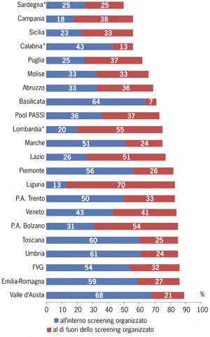 Nello screening cervicale la quota di adesione spontanea è rilevante: a livello nazionale si stima infatti che poco più di una donna su tre (37%) abbia eseguito il test di screening al di fuori del programma organizzato (si va dal 7% della Basilicata al 70% della Liguria).
