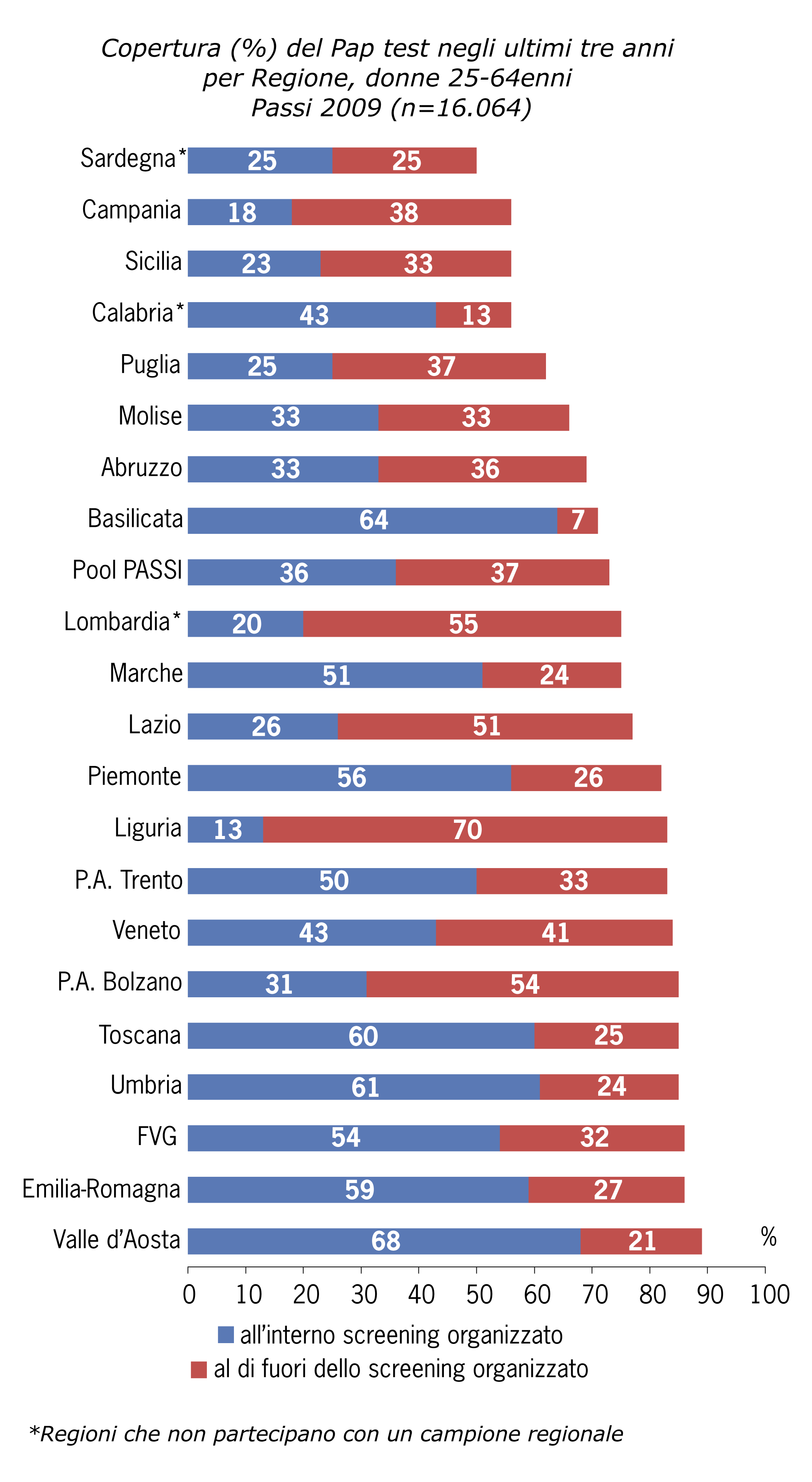 - il grafico “Copertura (%) del Pap test negli ultimi tre anni per Regione, donne 25-64enni Passi 2009 (n=16.064)” in formato gif
