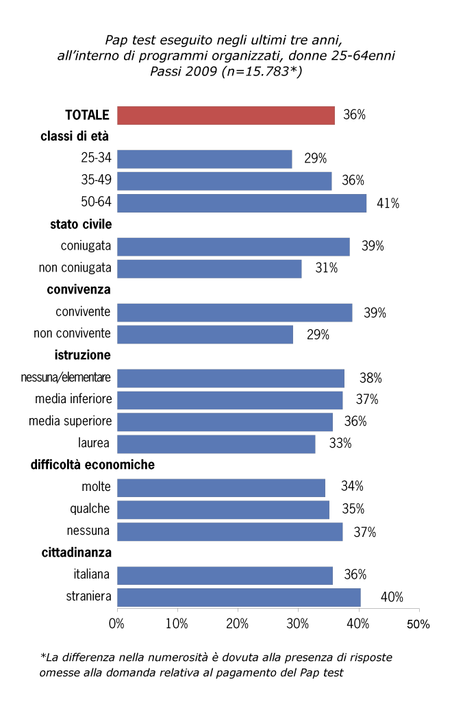 Le donne con minore livello di istruzione e difficoltà economiche, come pure quelle con cittadinanza straniera, raggiungono livelli di prevenzione meno buoni. Tuttavia queste differenze sono molto piccole o addirittura inesistenti nei programmi organizzati, mentre sono più grandi nello screening effettuato su iniziativa personale.