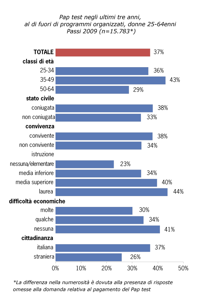 La metà delle donne ha praticato il test nell’ambito dei programmi organizzati dalle Asl, mentre l’altra metà lo ha effettuato per iniziativa personale. Questa caratteristica della pratica del Pap test, in Italia, ha alcune importanti conseguenze sul rispetto dell’intervallo raccomandato e sull’equità.