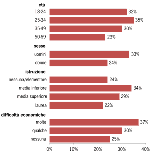 Emergono differenze statisticamente significative nel confronto tra le Regioni (si va dal 25% del Veneto al 32% dell’Abruzzo).