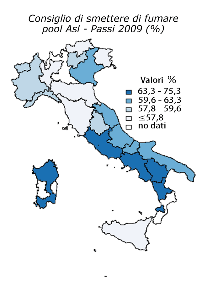 La mappa riporta la situazione relativa alla percentuale di persone che hanno ricevuto il consiglio di smettere di fumare, nelle Regioni e Asl che hanno raccolto nel 2009 un campione rappresentativo.