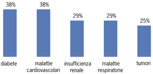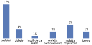 La percentuale di persone che riferiscono di essere affette da malattie croniche (come quelle respiratorie croniche, diabete, malattie cardiache, tumori e insufficienza renale) è pari al 15% (1.999/13.172). Le malattie respiratorie sono risultate le più frequenti.