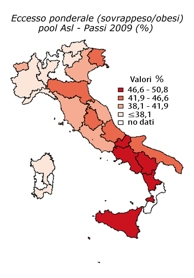 Secondo i dati raccolti nel 2009 del pool delle Asl che partecipano al sistema di sorveglianza Passi, circa tre adulti su dieci (32%) risultano in sovrappeso, mentre uno su dieci è obeso (11%): complessivamente, quindi, circa quattro adulti su dieci (42%) sono in eccesso ponderale.