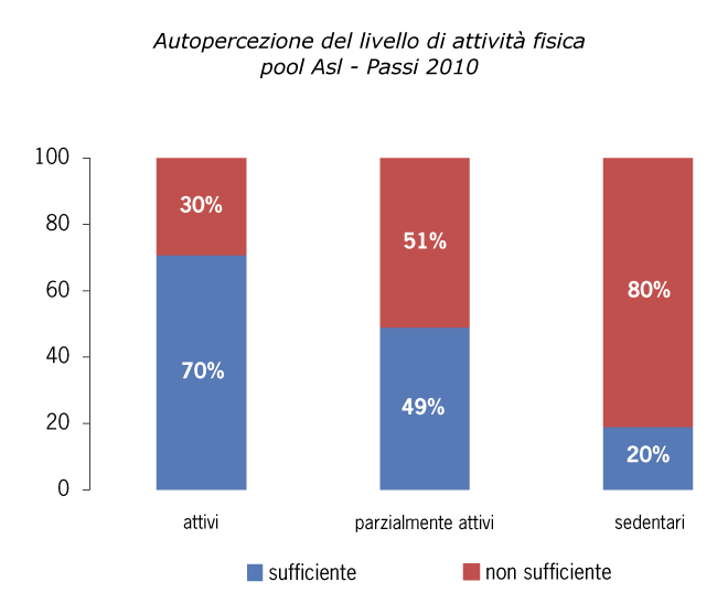 Non sempre la percezione soggettiva del livello di attività fisica praticata corrisponde a quello dell’attività effettivamente svolta. Nel pool di Asl partecipanti nel 2010, ancora un sedentario su cinque percepisce il proprio livello di attività fisica come sufficiente.