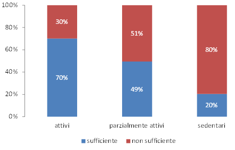 La maggior parte degli italiani svolge almeno qualche tipo di attività fisica. Tenendo conto delle indicazioni delle linee guida, il 33% può essere definito fisicamente attivo e il 37% parzialmente attivo. Tuttavia, circa un terzo della popolazione tra 18 e 69 anni risulta completamente sedentario, perché non svolge nessun tipo di attività fisica, né al lavoro né nel tempo libero. La sedentarietà risulta più diffusa al Sud, tra i 50-69enni, nelle donne, nelle persone con livello di istruzione più basso e in quelle che riferiscono molte difficoltà economiche. Dal 2007, relativamente al numero di sedentari nel nostro Paese si osserva una tendenza all’aumento.