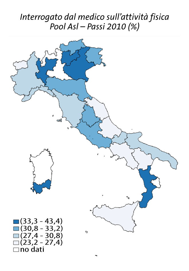 La mappa riporta la situazione relativa alla percentuale di persone che riferiscono che un medico o un altro operatore sanitario ha chiesto loro se svolgono attività fisica. Emergono differenze statisticamente significative nel confronto interregionale. La Basilicata registra il valore più basso (23%), la Sardegna quello più elevato (43%).