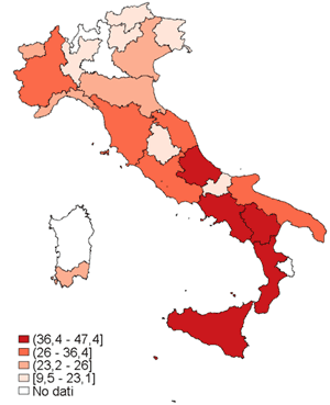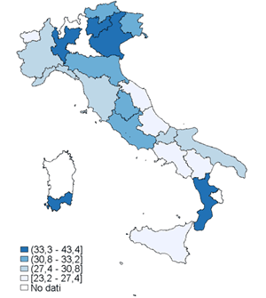 Si osservano differenze statisticamente significative nel confronto interregionale, con un gradiente Sud-Nord. Il valore più basso si registra nella P.A. di Bolzano (9%), quello più alto in Basilicata (47%).