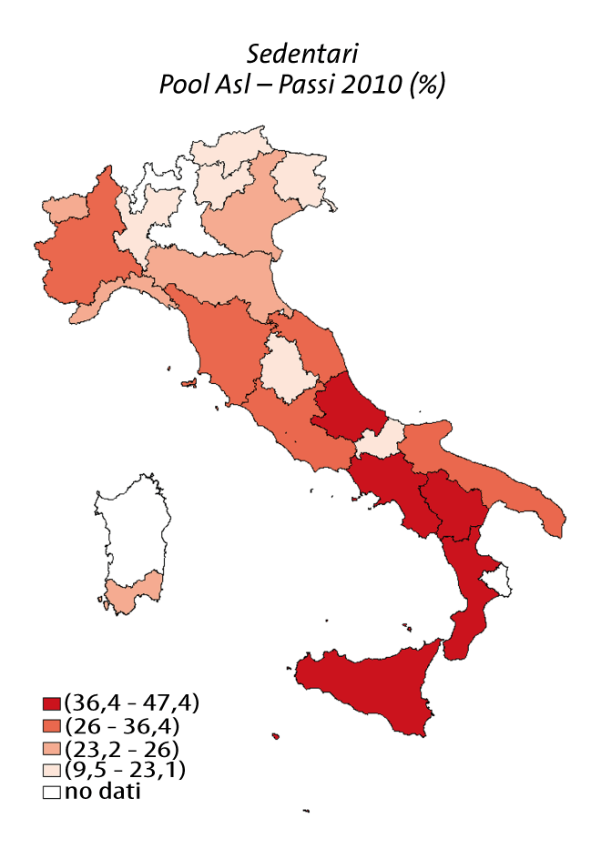 La mappa riporta la situazione relativa alla percentuale di persone che fanno scarsa attività fisica nelle Regioni e Asl che nel 2010 hanno raccolto un campione rappresentativo.