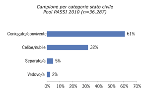 Nel pool di Asl, coniugati o conviventi rappresentano il 61% del campione, i celibi o le nubili il 32%, i separati o divorziati il 5% e i vedovi il 2%.