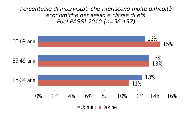 La frequenza di persone che dichiarano di avere molte difficoltà economiche aumenta con l’età e passando dal Nord al Sud.