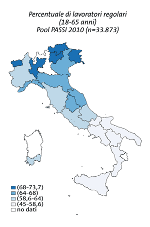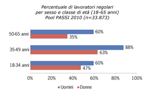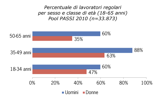 In tutte le fasce di età, l’occupazione regolare femminile è minore rispetto a quella maschile (complessivamente il 49% contro il 70%). Il lavoro regolare è più frequente nella fascia di età compresa tra i 35 e i 49 anni e il divario tra uomini e donne nell’avere un’occupazione regolare si riduce nelle giovani generazioni. Anche per il lavoro regolare si osserva in maniera abbastanza chiara un gradiente Nord-Sud.