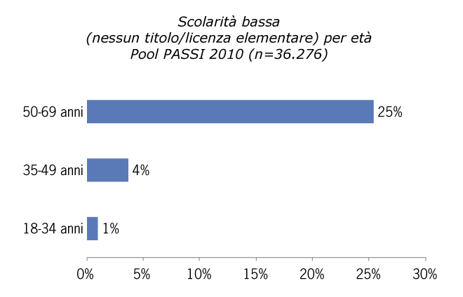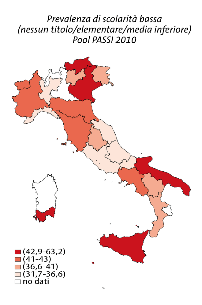 La prevalenza di scolarità bassa (nessuna/licenza elementare), inoltre, varia tra le Regioni e si osserva un gradiente Nord-Sud.