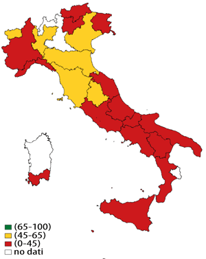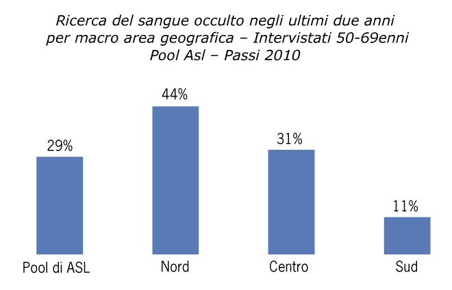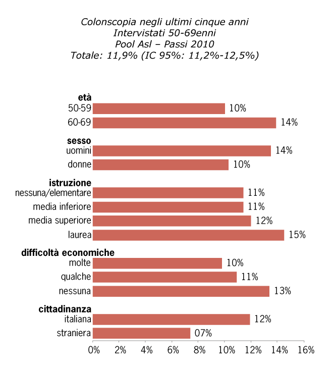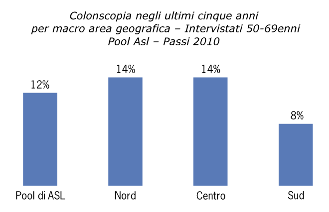 Nel 2010, il 12% dei 50-69enni riferisce di aver effettuato una rettosigmoidoscopia o colonscopia negli ultimi 5 anni. Questa percentuale è più alta al Nord (14%) e al Centro (14%), mentre è significativamente più bassa al Sud (8%).