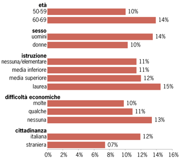 L’esecuzione della colonscopia negli ultimi cinque anni è più frequente nei 60-69enni (14%), negli uomini (14%), negli intervistati con un più alto livello di istruzione (15%), in quelli senza difficoltà economiche (13%) e con cittadinanza italiana (12%). Dall’analisi multivariata, tutte le associazioni sono confermate a eccezione di quella tra esecuzione della colonscopia e difficoltà economiche.