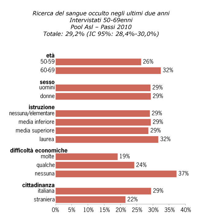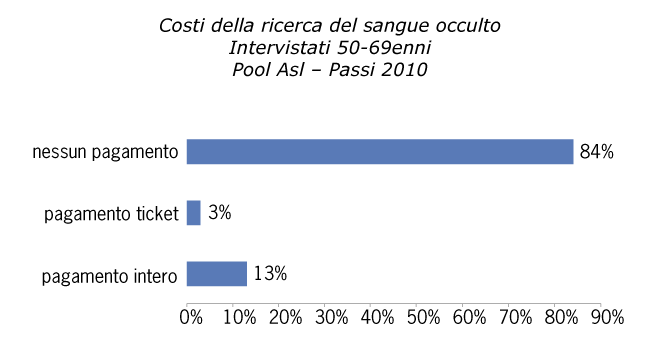 Nel 2010, l’84% degli intervistati nella fascia di età 50-69 anni ha riferito di non aver pagato per la ricerca del sangue occulto effettuata negli ultimi 2 anni, il 3% ha pagato solamente il ticket, mentre il 13% l’intero costo dell’esame.