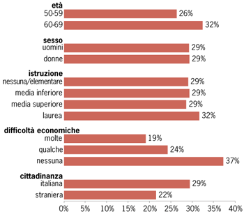 Il 29% degli intervistati nella fascia di età 50-69 anni riferisce di aver effettuato una ricerca del of negli ultimi due anni. Questa percentuale raggiunge valori più elevati al Nord (44%) e al Centro (31%), mentre è significativamente più bassa al Sud (11%).