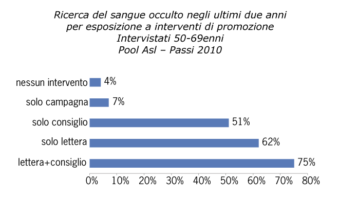 Il 33% dei 50-69enni ha riferito di aver ricevuto una lettera di invito da parte della Asl di appartenenza per fare la ricerca del sangue occulto, il 23% ha ricevuto il consiglio di un medico o operatore sanitario e il 35% ha visto o sentito una campagna informativa. Più della metà degli intervistati (52%) è stata raggiunta da almeno uno dei tre interventi di promozione per l’effettuazione della ricerca del Sof. La percentuale di esecuzione del test è più alta tra chi è stato raggiunto da più interventi di promozione. Infatti l’esame è stato eseguito, secondo i tempi raccomandati, dal 75% di chi ha ricevuto la lettera di invito associata al consiglio del medico, contro il 4% di coloro che non sono stati raggiunti da alcun intervento di promozione.