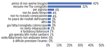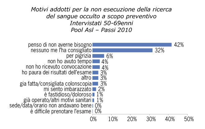 Le principali motivazioni addotte da chi non ha mai effettuato un esame del sangue occulto nelle feci sono il pensare di non averne bisogno (42%) e il fatto di non aver ricevuto consigli in merito. Questi motivi possono riflettere la mancanza di conoscenze sulla diagnosi precoce, la sottovalutazione del rischio di cancro colorettale e infine un’insufficiente opera di orientamento da parte degli operatori sanitari.