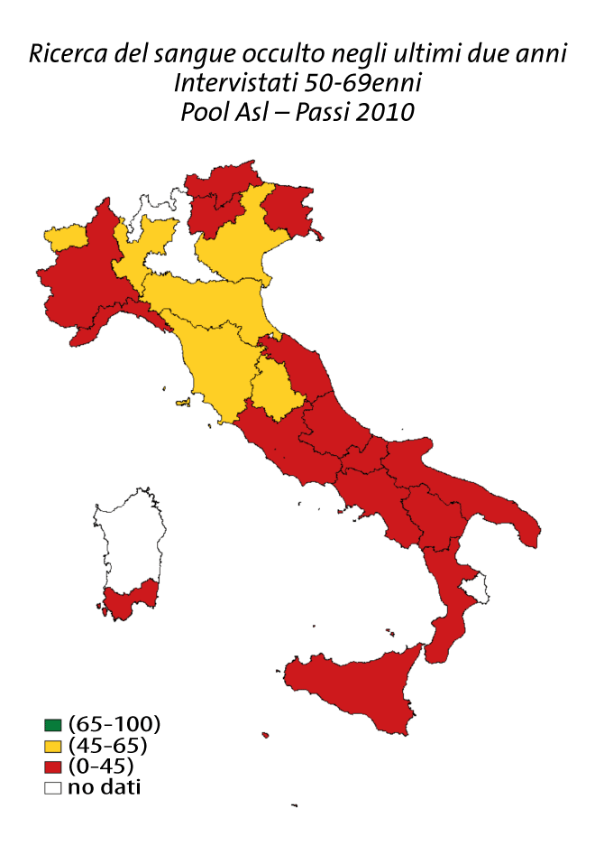 Nel 2010, sulla base dei dati raccolti dal sistema di sorveglianza Passi, il 36% delle persone intervistate nella fascia di età 50-69 anni ha riferito di aver eseguito un esame per la diagnosi precoce dei tumori colorettali a scopo preventivo, in accordo con le raccomandazioni (ricerca del sangue occulto fecale (of) negli ultimi due anni, oppure colonscopia negli ultimi cinque anni). Nel Piemonte e in alcune Asl del Veneto, il dato Passi di copertura mostra una sottostima dovuta a un programma di screening dei tumori colorettali previsto per la popolazione a partire dall’età di 58 anni, invece che di 50.