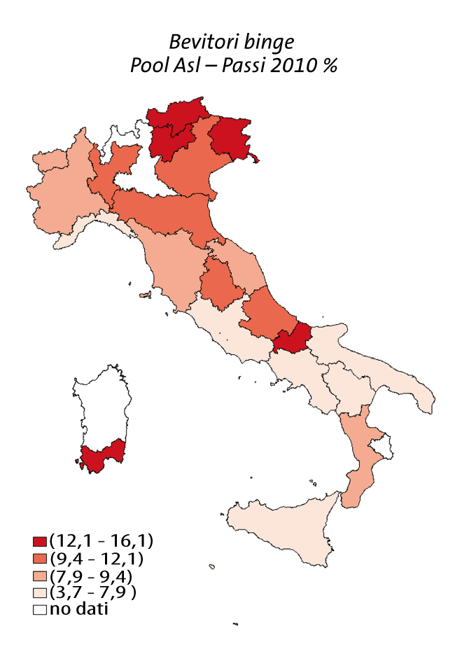 La mappa riporta la percentuale di bevitori binge nelle Regioni e Asl che nel 2010 hanno raccolto un campione rappresentativo. Il range varia dal 4% della Sicilia e della Campania al 16% del Friuli-Venezia Giulia e della P.A. di Bolzano. Si osservano differenze statisticamente significative nel confronto tra le Regioni.