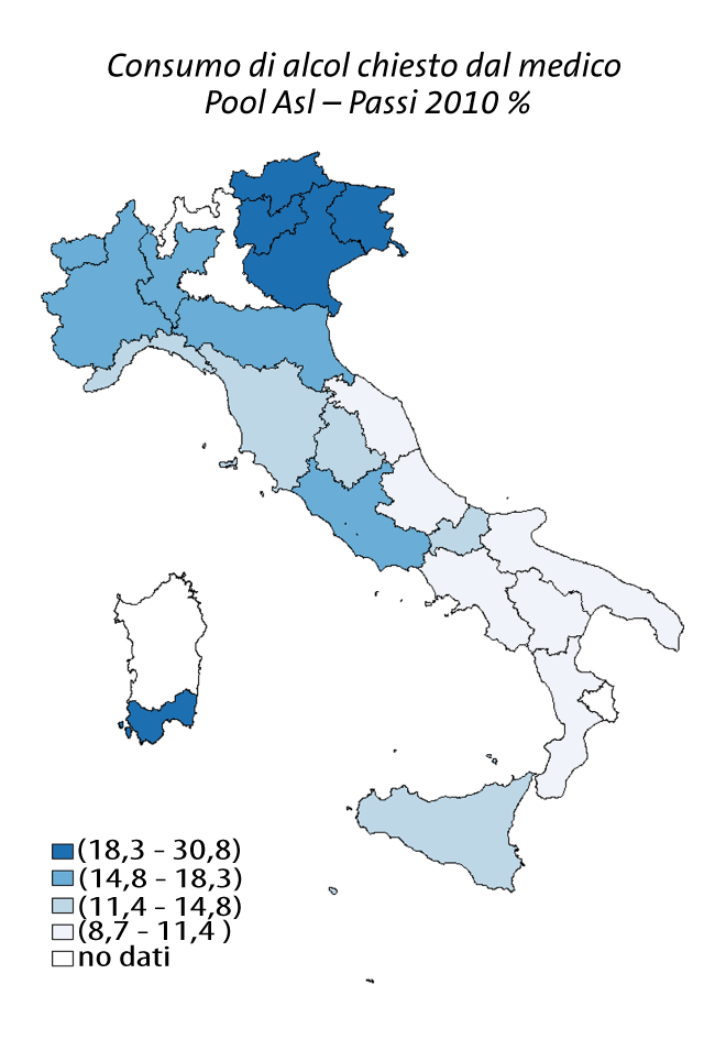 La mappa riporta la situazione relativa alla percentuale di persone da considerare bevitori a rischio nelle Regioni e Asl che nel 2010 hanno raccolto un campione rappresentativo. Il range varia dal 9% della Campania al 44% della P.A. di Bolzano. Si osservano differenze statisticamente significative nel confronto tra le Regioni, con un gradiente Sud-Nord.
