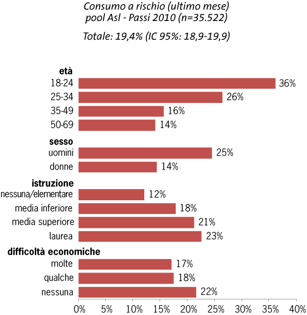 Il consumo a rischio è più frequente tra i giovani di età 18-34 (in modo particolare tra i 18-24enni), gli uomini, le persone con livello di istruzione medio-alto e chi non ha difficoltà economiche.