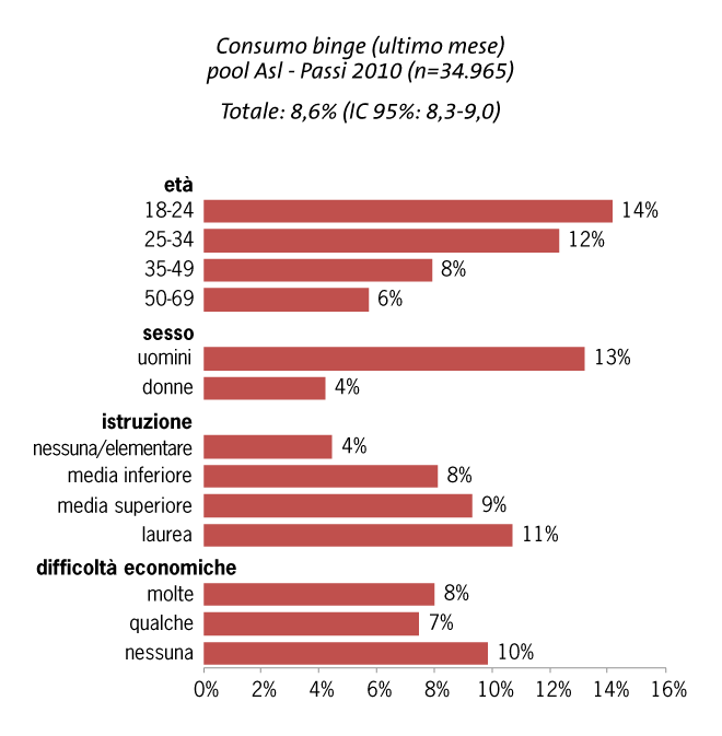 Il consumo binge è più frequente tra i giovani dai 18 ai 34 anni (in modo particolare tra i 18-24enni), gli uomini, le persone con livello di istruzione alto e senza difficoltà economiche. L’analisi logistica multivariata conferma l’esistenza di un’associazione tra consumo binge età, sesso ed istruzione, ma non con le difficoltà economiche.