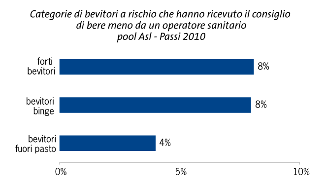Nonostante la capacità del medico di affrontare l’argomento alcol con i pazienti sia giudicata da questi come segno di una buona relazione medico-paziente e risulti anche efficace nel ridurre il consumo e gli effetti negativi dell’alcol, i dati Passi mostrano che l’attenzione dei medici e degli altri operatori sanitari rispetto a possibili problemi dai loro pazienti, associati al consumo di alcol resta molto bassa; inoltre, solo pochi bevitori a rischio riferiscono di aver ricevuto dal proprio medico il consiglio di bere meno. Questa è quindi un’area di intervento in cui sono possibili grandi miglioramenti.