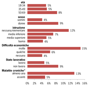 Tenendo conto delle interazioni tra questi fattori con un’analisi multivariata, si conferma l’associazione dei sintomi di depressione con il sesso, il livello di istruzione, le difficoltà economiche, lo stato lavorativo e la presenza di malattie croniche. Non è invece confermata l’associazione con l’età.