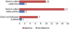 Meno di un terzo di chi riferisce sintomi di depressione (31%) descrive il proprio stato di salute come “buono” o “molto buono”, contro il 70% delle persone senza sintomi depressivi. Tra le persone che dichiarano sintomi di depressione, è significativamente più alta sia la media di giorni in cattiva salute fisica e mentale sia quella dei giorni con limitazioni di attività.