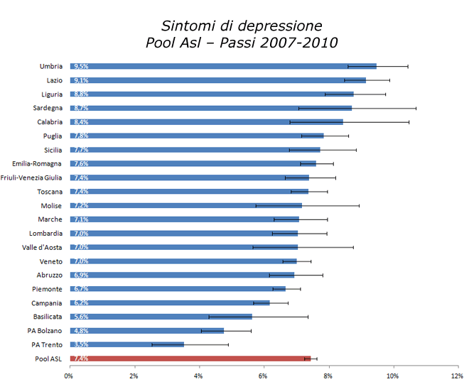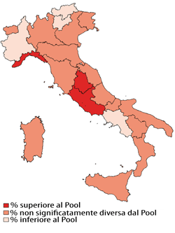 Per un confronto interregionale più attendibile, la percentuale di persone che riferisce sintomi di depressione è stata calcolata sul pool quadriennale 2007-2010. La mappa riporta le Regioni in cui la prevalenza dell’indicatore è in linea con il dato di pool (differenza non significativa dal punto di vista statistico), quelle con prevalenza superiore e quelle con prevalenza inferiore rispetto al dato medio di pool 2007-2010 (differenza significativa dal punto di vista statistico). I dati regionali del 2007-2010 relativi ai sintomi di depressione sono riportati nel diagramma.