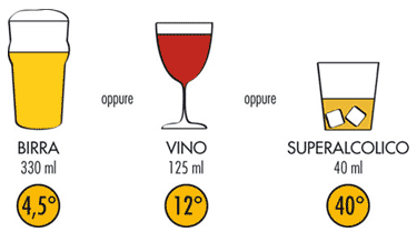 Il consumo di alcol si misura in unità alcoliche. L’unità alcolica corrisponde a 12 grammi di etanolo, contenuti in una lattina di birra (330 ml), un bicchiere di vino (125 ml) o un bicchierino di liquore (40 ml), alle gradazioni tipiche di queste bevande.
