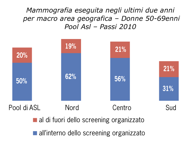 Nelle Asl che hanno partecipato al Passi nel 2010, il 70% delle donne 50-69enni ha eseguito la mammografia preventiva nel corso dei precedenti due anni. La copertura complessiva al test di screening raggiunge valori più alti al Nord (81%) e al Centro (77%), mentre è significativamente più bassa al Sud e nelle Isole (53%).
