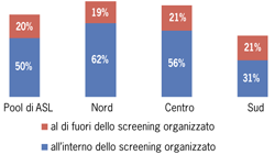 La mammografia viene effettuata in gran parte nell’ambito dei programmi organizzati dalle Asl: una donna su cinque (20%) ha eseguito lo screening mammografico su iniziativa personale (si va dal 4% della Basilicata e Valle d’Aosta al 34% della Liguria).