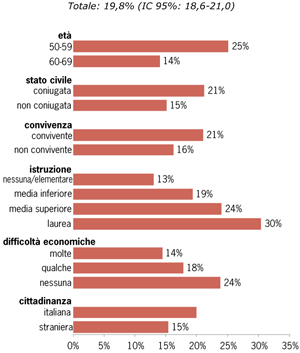 L’effettuazione regolare dell’esame è più frequente nelle donne di 50-69 anni, in quelle coniugate o conviventi, con un livello di istruzione più elevato e senza molte difficoltà economiche. La copertura tra le donne italiane è più alta rispetto alle straniere (70% vs. 59%). L’analisi multivariata conferma l’associazione con l’età, la convivenza, il livello di istruzione e lo status economico.