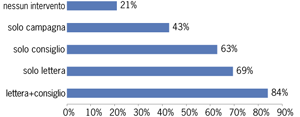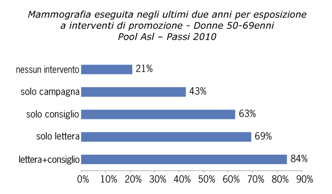 La maggior parte (91%) delle donne 50-69enni è stata raggiunta da almeno un intervento di promozione dello screening. La percentuale di esecuzione della mammografia negli intervalli raccomandati è più alta nelle donne raggiunte da più interventi di promozione, come accade generalmente all’interno dei programmi di screening organizzati. L’esame è stato eseguito secondo i tempi raccomandati dall’84% delle donne 50-69enni che hanno ricevuto la lettera di invito associata al consiglio di un operatore sanitario, contro il 21% di quelle non raggiunte da alcun intervento di promozione.