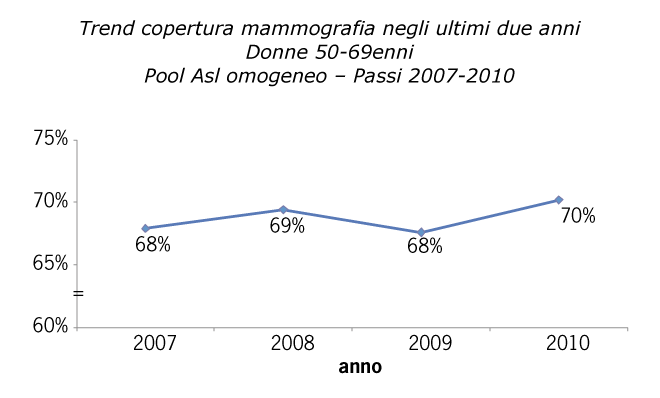 Per un confronto interregionale più attendibile, la copertura della mammografia negli ultimi due anni è stata calcolata anche sul pool quadriennale (2007-2010), come illustra la figura.