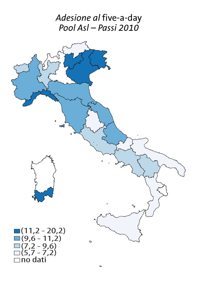 La mappa riporta la distribuzione geografica dell’adesione alle 5 porzioni al giorno. Il valore più basso si registra nelle Asl della Calabria (6%), il più alto in Liguria (20%).