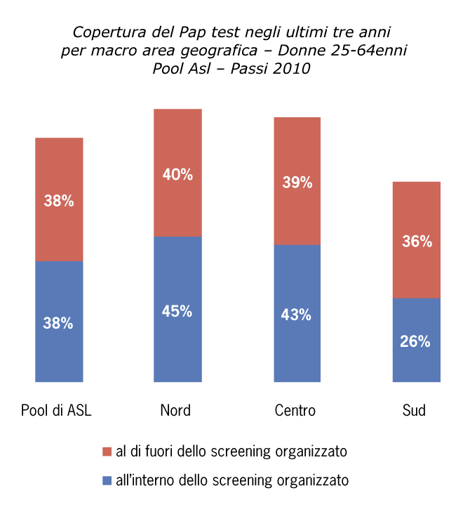 Nel 2010, nel pool di Asl italiane che hanno partecipato alla rilevazione, il 76% delle donne 25-64enni ha eseguito un Pap test preventivo nel corso dei tre anni precedenti l’intervista. La copertura complessiva al test di screening raggiunge valori elevati al Nord (85%) e al Centro (82%), mentre è più bassa al Sud (62%).