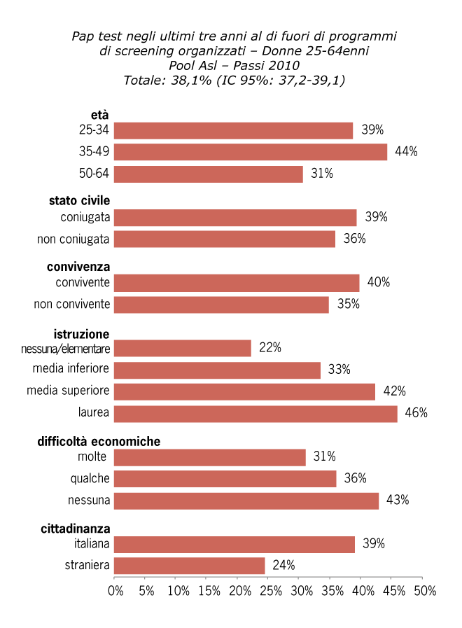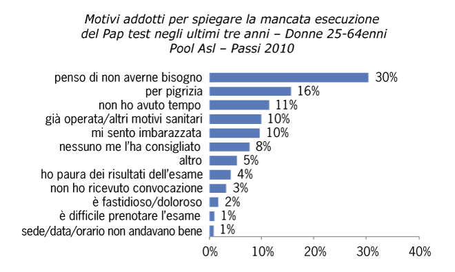 Nel 2010, circa il 24% delle donne di 25- 64 anni non è risultata coperta per quanto riguarda la diagnosi precoce del tumore del collo dell’utero in quanto o non ha mai effettuato il Pap test (15%) o l’ha effettuato da più di tre anni (9%). I motivi addotti per spiegare la mancata esecuzione del test sono molteplici. Quello che ricorre con maggior frequenza (“penso di non averne bisogno”), solo in minima parte può essere associato a donne che non hanno mai avuto rapporti sessuali. È invece verosimile che la maggior parte delle donne che dichiarano di non aver bisogno del test ignorino o sottovalutino il rischio di cancro, o l’efficacia del Pap test.