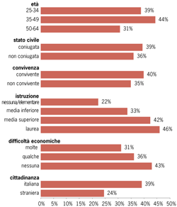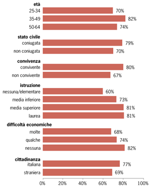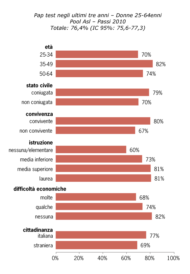 La copertura al test di screening è maggiore nelle donne di 35-49 anni (82%), in quelle coniugate (79%) e conviventi (80%) e nelle italiane rispetto alle straniere (77% vs. 69%).
